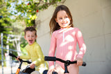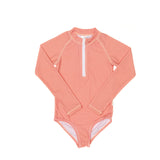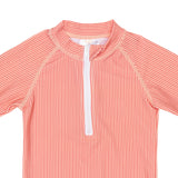 Our Long Sleeve Suit in ROSE & PEACHIE has a beautiful modern stripe pattern. The suit is unlined for a lighter feel and with a zipper on the front for easy access.